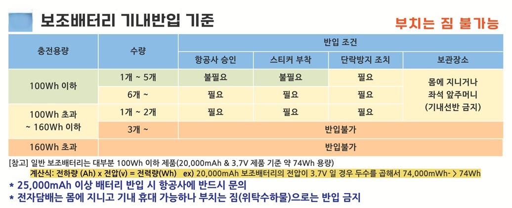 • 기내 보관 위치: 보조배터리는 반드시 승객이 직접 소지하거나 앞좌석 주머니에 보관해야 합니다. 기내 선반(오버헤드 빈)에는 보관이 금지되어 있습니다.
